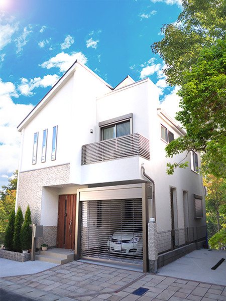 ─ 自然素材の塗り壁と天然石で街並みに映える高級感を演出 ─